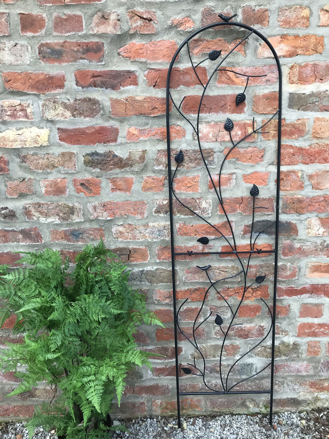 This garden wall trellis is a quick and instant way to create height for flower plants to bloom adding structure and interest to garden wall, fences or as a patio wall feature with the detail ironwork of leaves, birds this obelisk will be an attractive addition even during the weather months. Constructed from steel as a two-frame section support and coated with a matt black, which offers a contemporary looking finish and offers protect against corrosion and weathering.