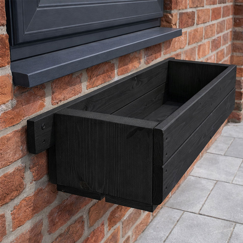 This readymade window box comes fully assembled and ready to use, with heavy-duty construction designed for long-lasting outdoor use. Made in Great Britain from high-quality planed Swedish Redwood, this wooden window box planter features an 18 mm thick base and sides, plus strong 35 mm end panels for added durability, making it a reliable outdoor window box and garden planter box. Finished in a black Weather-Shield wood stain, this weatherproof planter is built to withstand year-round conditions while helping extend the life of the timber. Ideal as a flower window box or herb planter, it includes a rear mounting plate and pre-drilled holes for easy installation as a secure wall mounted planter.