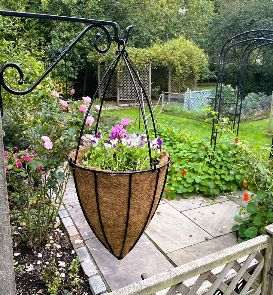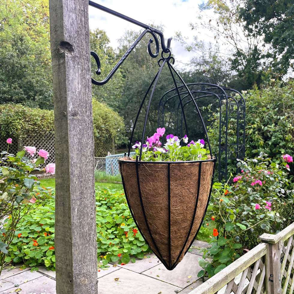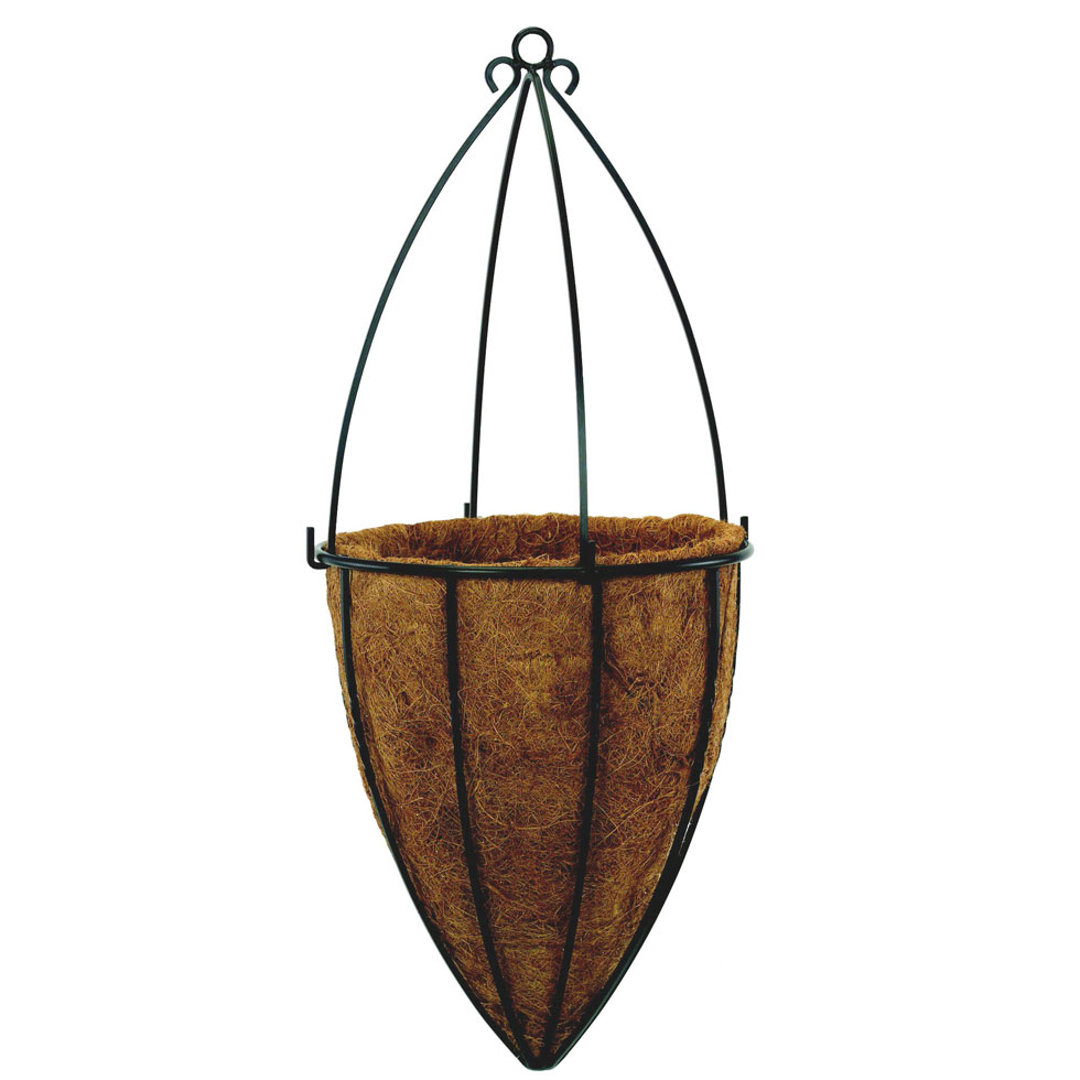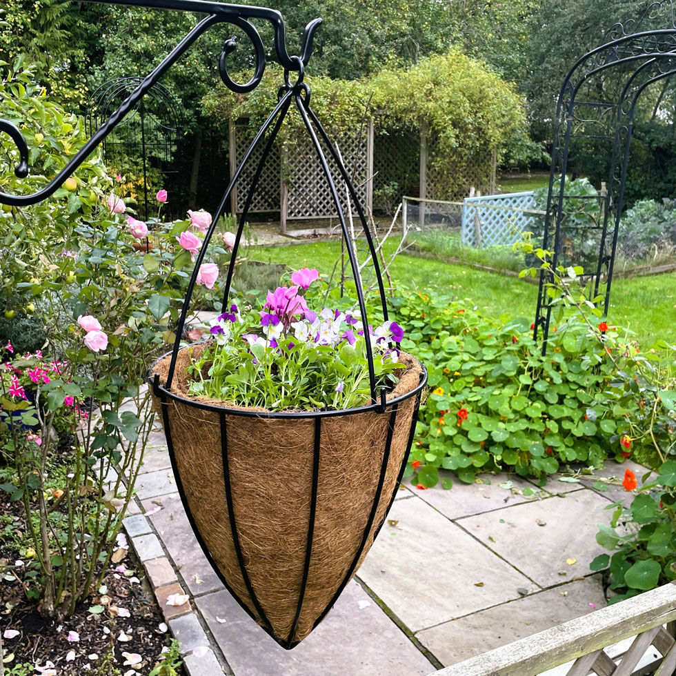 This Metal Cone Hanging Basket, with a 35cm diameter, features enhanced depth to promote optimal root development. Constructed from durable black metal with a pre-installed coco liner.