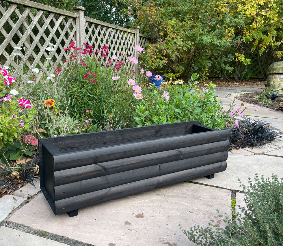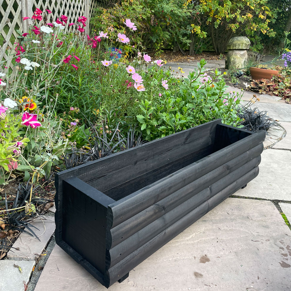 Black wood stain enhances the wood planter, giving it a sleek, polished finish that highlights the natural texture of the wood while adding a touch of sophistication.