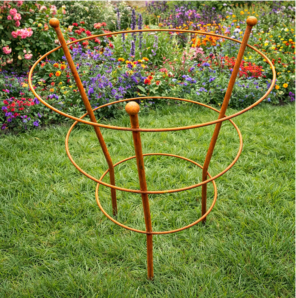 This Peony Basket plant support features a natural finish that blends effortlessly into any garden while providing dependable support for plants season after season. Constructed from strong, high-quality metal using 7 mm solid rod, this metal plant support is purposely left untreated so it can gradually develop a natural patina once placed outdoors. Ideal for supporting peonies and other tall blooms, this garden plant support frame helps guide and protect flowers as they grow, making it a practical and decorative addition to any border or flower bed. Designed with a wide square frame and finished with decorative ball finials, this peony support cage adds charming country-garden character to planting areas. Suitable for year-round use, the rustic garden plant support can simply be pushed into the soil and left in place to provide reliable stability throughout the seasons.