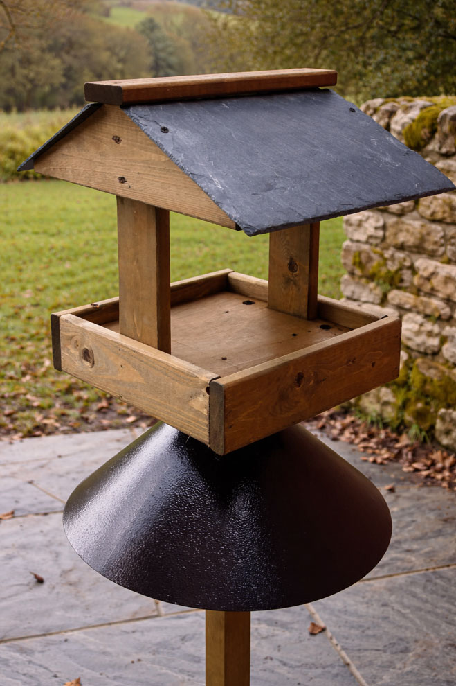This bird table with squirrel baffle is a wildlife feeding table designed for durability, practicality, and classic garden style. Built as a squirrel resistant bird table, it features a heavy-duty squirrel baffle to prevent pests from reaching the feed, allowing wild birds to dine safely and undisturbed. A real slate tile roof adds both weather protection and a timeless, natural finish, making it a true premium bird table for any outdoor space.