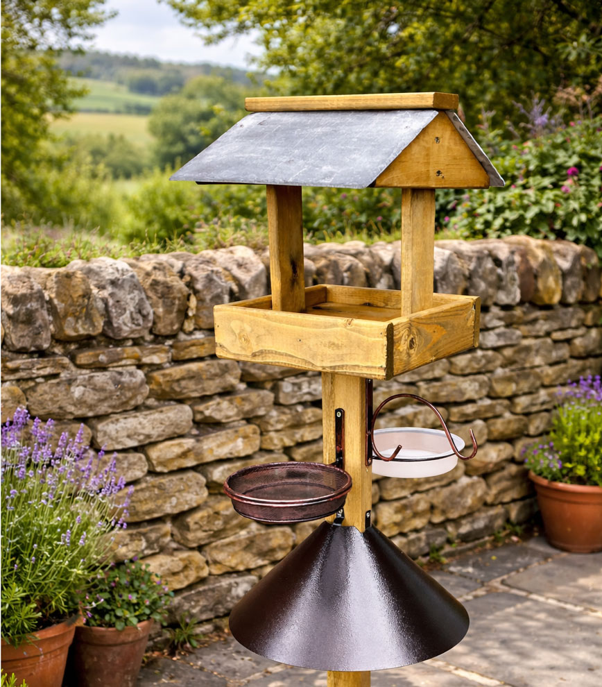 Give garden birds a safe and stylish place to feed with this elegant wooden bird table feeding station, complete with a durable metal squirrel baffle. Designed as a squirrel proof bird table, it prevents climbing pests from reaching the feeding area, allowing birds to dine undisturbed.