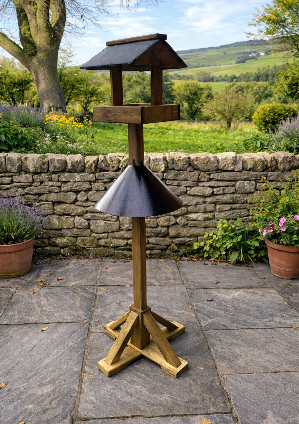 Give garden birds a safe and stylish place to feed with this elegant wooden bird table feeding station, complete with a durable metal squirrel baffle. Designed as a freestanding bird table and wild bird feeding stand, it stops squirrels from climbing into the feeding area, helping protect food while allowing birds to dine undisturbed. The integrated anti-climb squirrel guard ensures only birds can access the feeding platform.
