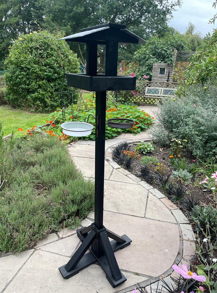 Garden birds can feed comfortably and easily on the bird table top, which measures 39 cm wide, 30 cm deep, and 40 cm high.