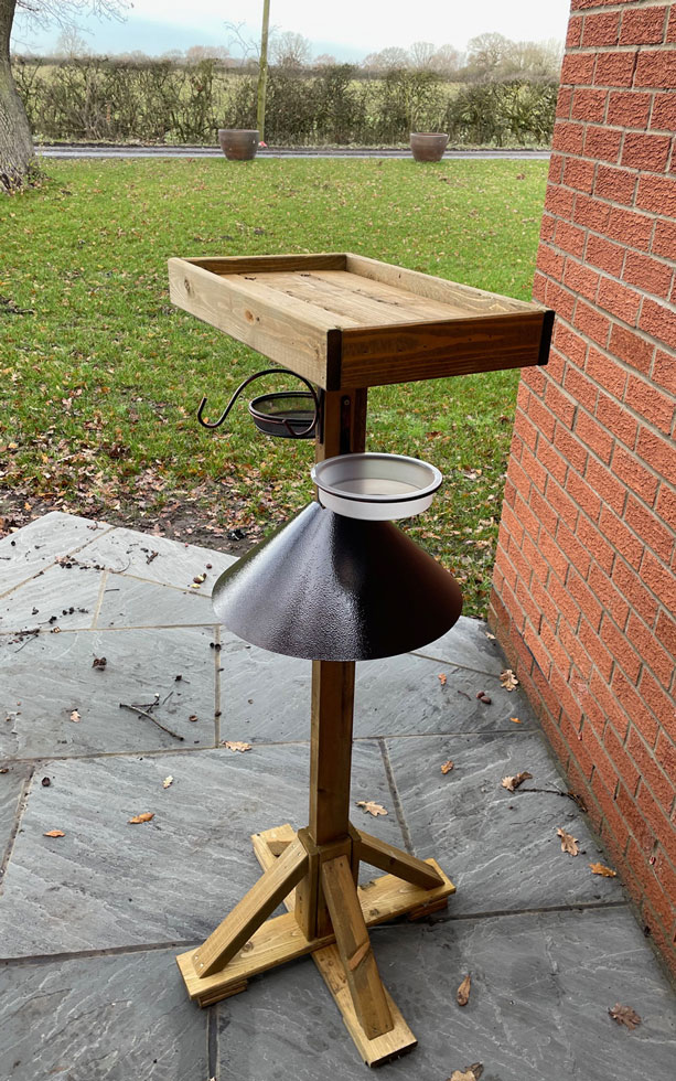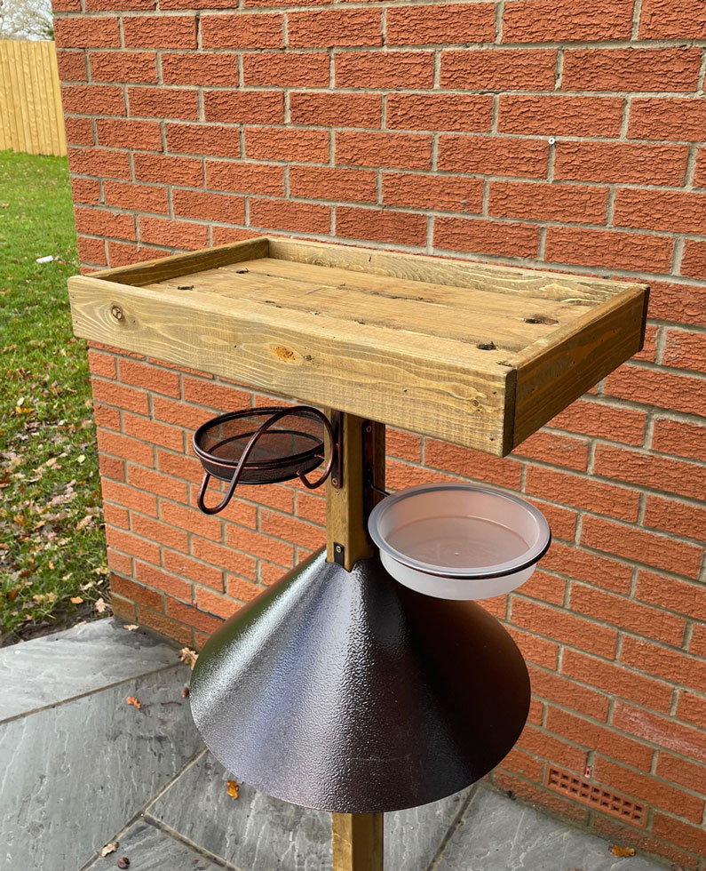 Provide a safe and spacious feeding area for garden birds with this sturdy wooden bird table. Designed with an extra-large feeding tray and a strong metal squirrel baffle, it helps keep food accessible to birds while discouraging pests, this wooden bird table is built to withstand the elements and regular use. Supplied ready made in three sections, it assembles quickly and easily. Handcrafted in the UK and finished with a protective weather-shield stain, it is an attractive, long-lasting addition to any garden bird table setup, ideal for year-round bird feeding and a durable UK made bird table.