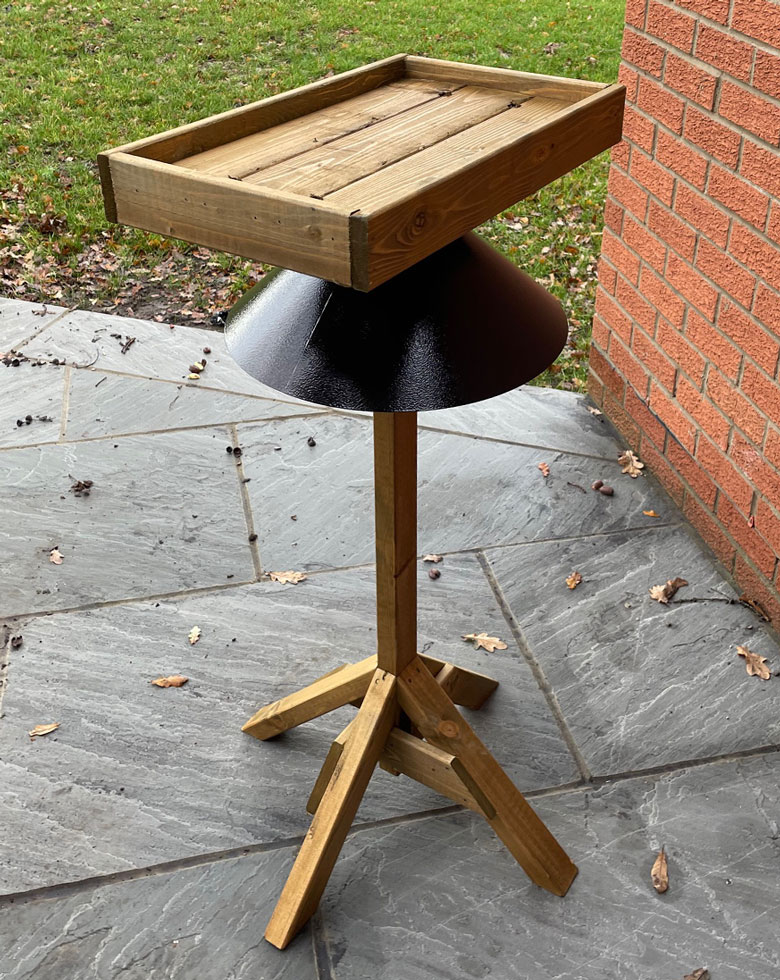 This large wooden bird table feeding station is designed to attract a wide variety of garden birds while keeping their food protected. It features an extra-large feeding tray and a durable heavy-duty, powder-coated metal squirrel baffle that helps prevent squirrels from climbing up and accessing the feed. Crafted from sustainably sourced timber, the table is weather-resistant and built for long-term outdoor use. The feeding station includes a clear water and bathing bowl, a large micromesh feeding tray, and a metal hook for hanging an additional feeder. Supplied ready made in three parts, it is quick and easy to assemble. Finished with a protective weather-shield wood stain and handcrafted in the UK, this sturdy bird table is an attractive and practical addition to any garden or patio.