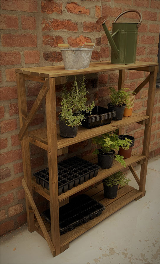 This four-tier wooden greenhouse staging is made from Swedish redwood and built to last. With minimum construction needed this is supplied in six pieces with fixings included. All holes are predrilled, four shelves all come complete and the sides are also complete units. Ideal for use in the greenhouse for potting on those seedlings or storing your seed trays. This shelving can also be used in the garage as a good space saving item or as an additional work station platform. This greenhouse racking is ideal for general storage. Made in UK.